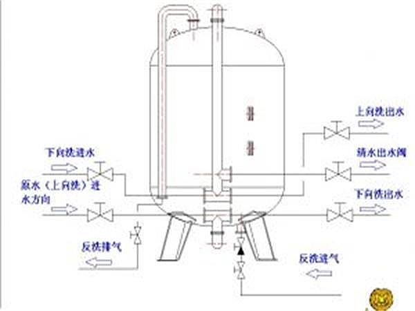 反洗:關(guān)掉滲水離心水泵,開啟閘閥c、b,關(guān)掉別的閘閥,開反洗離心水泵開展反洗,把水歷經(jīng)過濾器底端,自下高于一切對氧化塔開展松脫1-2min,然后終止水清洗,開展氣洗3-5min,隨后再水氣另外反洗8-10min,最終水清洗2-3min,全部反洗全過程約20min。